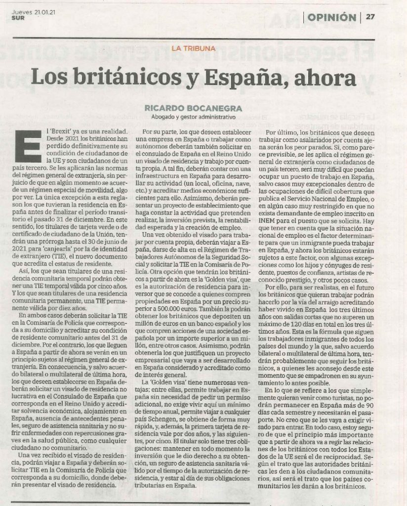 En este artículo, publicado en el diario SUR, Ricardo Bocanegra, como experto en extranjería, explica las opciones que tendrán los británicos para obtener el permiso de residencia.